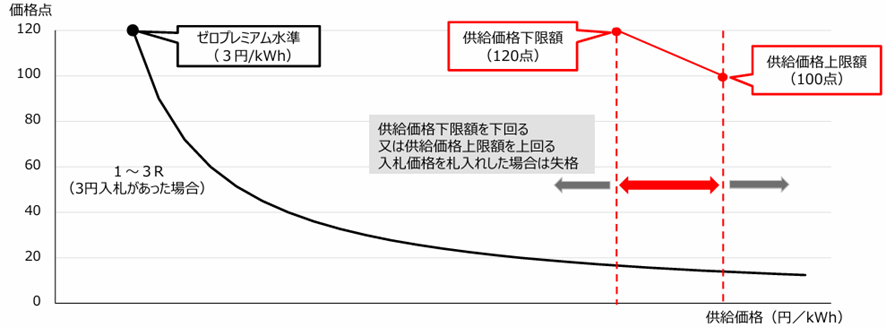価格評価では供給価格上限額(入札上限価格)に加えて下限額をも導入し、それぞれ120点、100円と評価し、超過する場合はいずれも失格となる。ダンピングの疑いがあるような入札は失格とすることで、R1の轍を踏まないとの方針である。下限額は「事業完遂のために必要と考えられる水準を前提とした上で、事業者が現実的な創意工夫を講じた場合の価格」としているが、これはコストが回収できるぎりぎりの水準と解釈できよう。