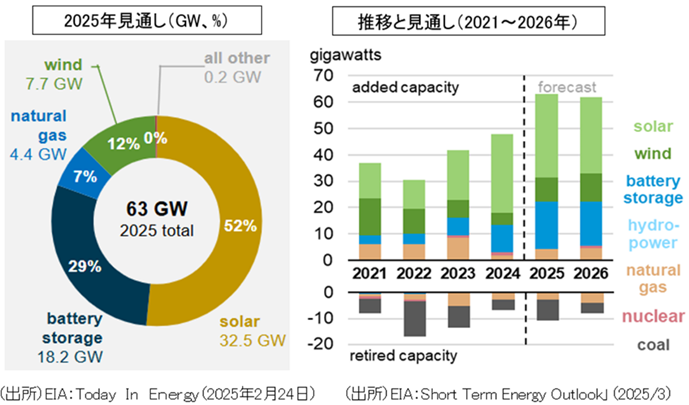 3月11日にエネルギー省(DOE)のエネルギー情報局(EIA:Energy Information Administration)は、2025年の電力供給予想を発表した。図1は、2025年の電源追加容量(電源開発)の見通しおよび2021~2026年の追加・廃止容量の推移を示したものである。