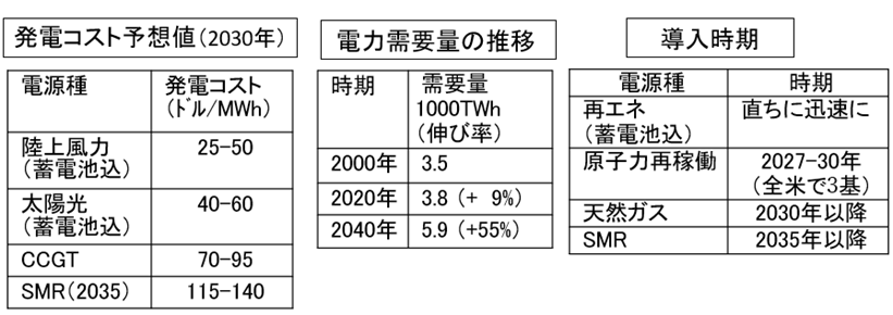 同社は、データセンター等電力需要の急増が見込まれる中で、供給力についてどう考えているのであろうか。CEOのジョン・ケッチャム氏は、1月24日の決算説明会において、「需要が急増するなかではタイムリーに投資をしないと電気料金は上がる。投資すべき電源はコスト、規模(容量)、スピードが3大要素となるが、太陽光・風力・蓄電池は圧倒的に有利である。」と語った。また、ガス火力や原子力の投資も検討しているが、「大規模電源は開発に時間がかかる。ガス火力は2030年頃、小型原子炉(SMR)は技術や燃料問題があり2030年代の終わり頃と予想している(表1)。」とする。