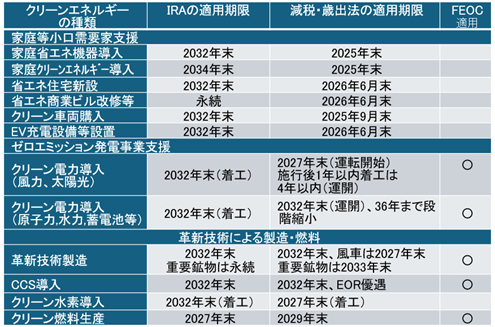 表1.税額控除等の適用期間比較(IRA、減税・歳出法) /大幅に適用期間短縮