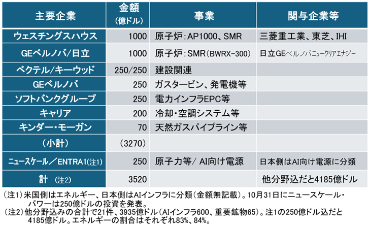 米ウェスチングハウス・エレクトリック(WH)は約1000億ドル規模のプロジェクトとされ、新型炉「AP1000」や小型モジュール炉(SMR)の開発を軸に据える。日本からは三菱重工、東芝、IHIが関心企業として名を連ねる。米政府は10月28日、WHと親会社のカメコ、ブルックフィールドとの戦略的提携を発表。AP1000の建設計画を支援し、円滑な許認可と事業収益性の確保を前提に最大800億ドル規模の資金支援(融資・保証等)を検討する方針を明らかにした(表2)。