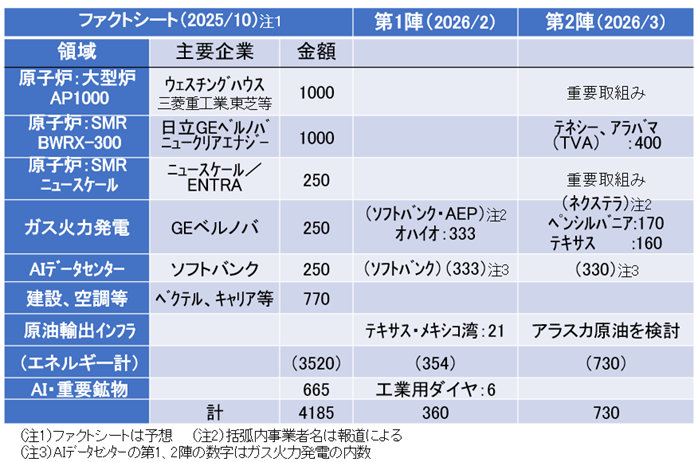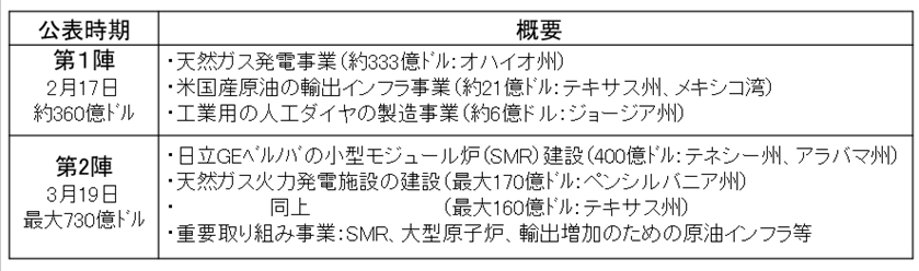 2025年7月に、トランプ政権が課した関税率を引き下げる見返りとして米国内での5500億ドル(87兆円)の投資が合意された。9月に対象分野や手順等を定めた覚書(MOU)が締結され、10月28日にはエネルギー、AI電力、AIインフラ、需要鉱物から成る約4000億ドルにおよぶ事業イメージ(ファクトシート)が公表された。その後、5回におよぶ協議委員会を経て、2026年2月17日は第1陣、3月19日には第2陣の事業が公表された(表1)。