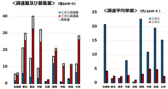 募集が大幅に未達となり、落札価格は高騰している。図2は、2023年度の3次①②の募集量と調達量(左)および超対平均価格(右)である。特に3次①は、未達が大きく価格は高い。