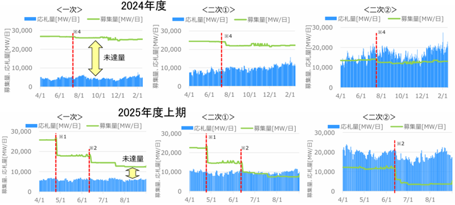 2025年度に入っても、この傾向は継続している。図3は、2024年度と2025年上期の1次、2次①②の取引状況を示している。2025年度に入り、募集量を減らしたこともあり、未達量は減少ないし消滅する傾向にあるが、1次はなお未達の状況にある。