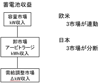 蓄電池は、多様な機能をもち、いくつかの市場を利用して収益を上げることができる。容量市場では、ピーク時に存在する価値として落札した容量に容量価格を乗じた収入を得られる。持続時間4時間以上の蓄電池は調整係数1.0となり、有利な運用が可能となる。卸市場では、余剰時の低価格電力を購入(充電)し、逼迫時の高価格電力を販売(放電)することで、利益を得る。タイムシフト(アービトラージ)価値である。需給調整市場では、短期調整力として待機し緊急時に稼働する「ラストリゾート」的な役割を演じる。